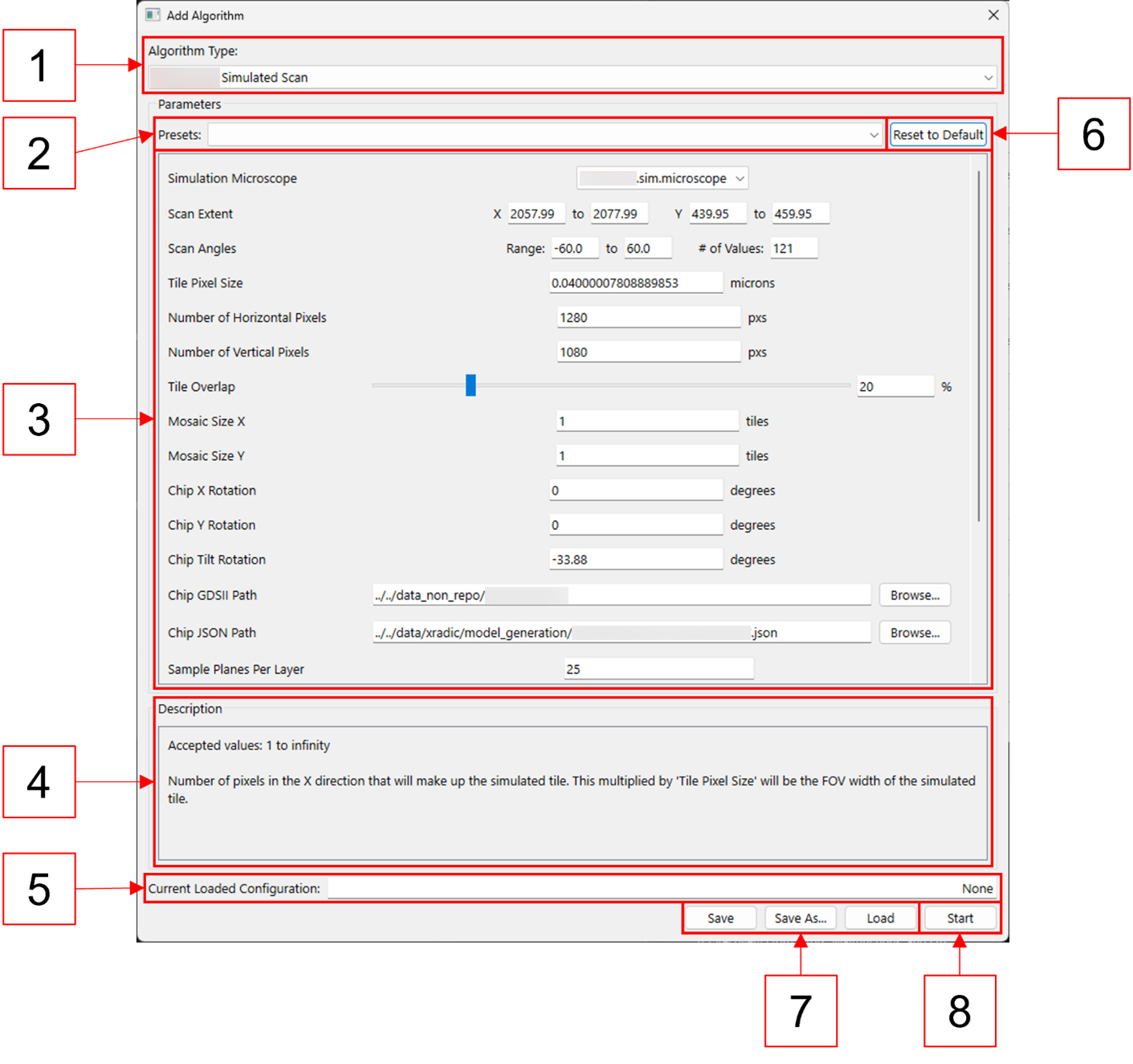 This is the dialog window that allows the user to configure an algorithm to run. Each algorithm type has its own set of parameters and some have presets for faster setup. The user can save/load algorithm configurations.